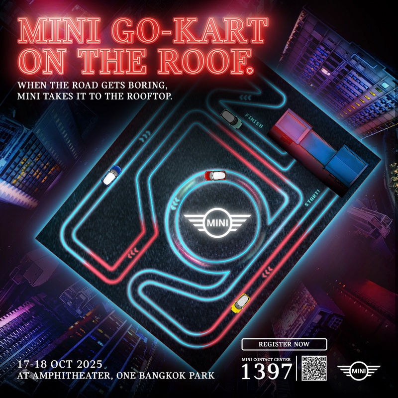 MINI Thailand จัดกิจกรรม MINI Go-Kart On The Roof ให้ทดลองขับมินิ EV แบบเอ็กซ์คลูซีฟ เปิดประสบการณ์ใหม่กับ All-Electric MINI Cooper SE พลังขับเคลื่อนไฟฟ้า 100% ที่ MINI Roof Track บนดาดฟ้าตึก Amphitheater, One Bangkok Park ระหว่าง 17 - 18 ตุลาคม 2568 เวลา 16:00 - 22:00 น.