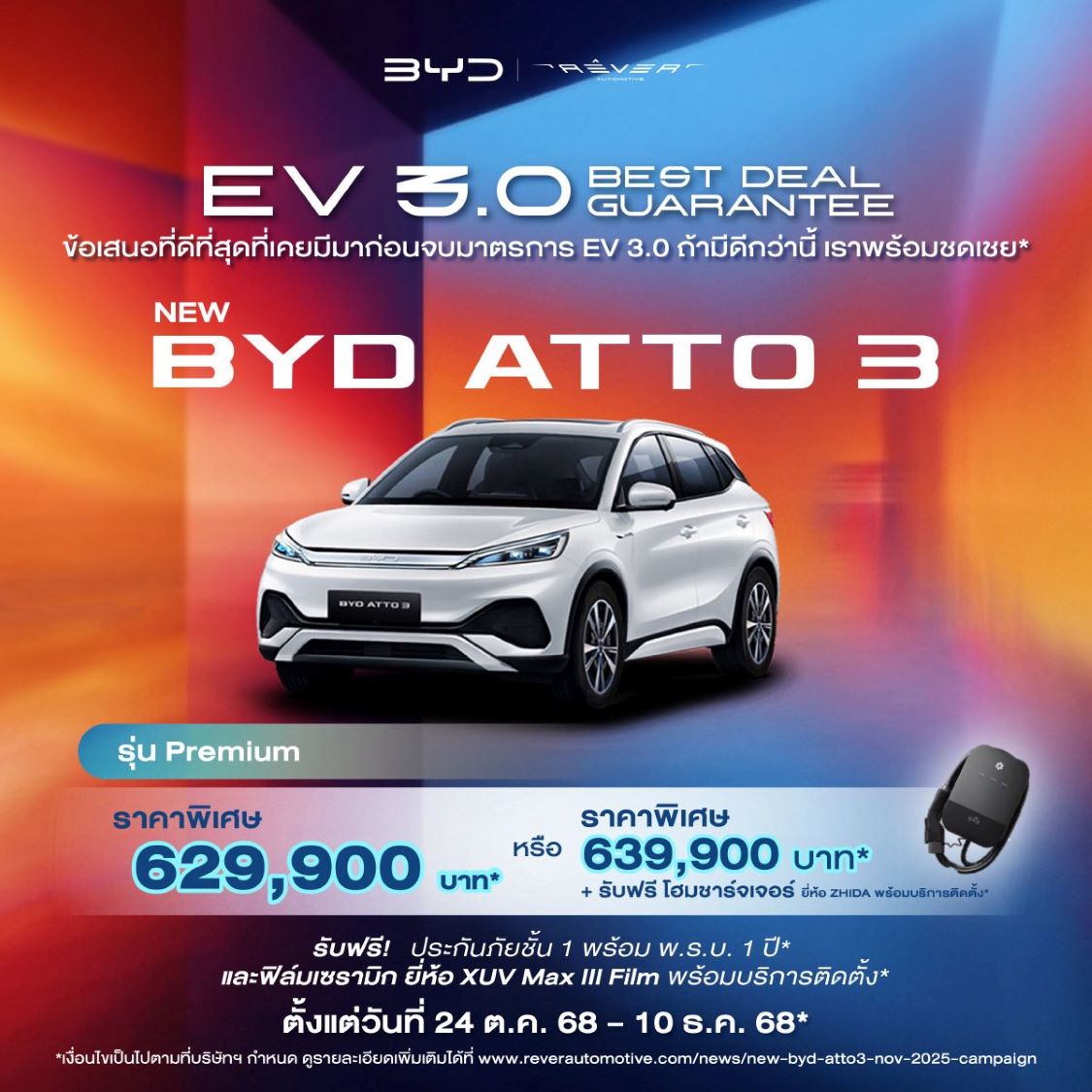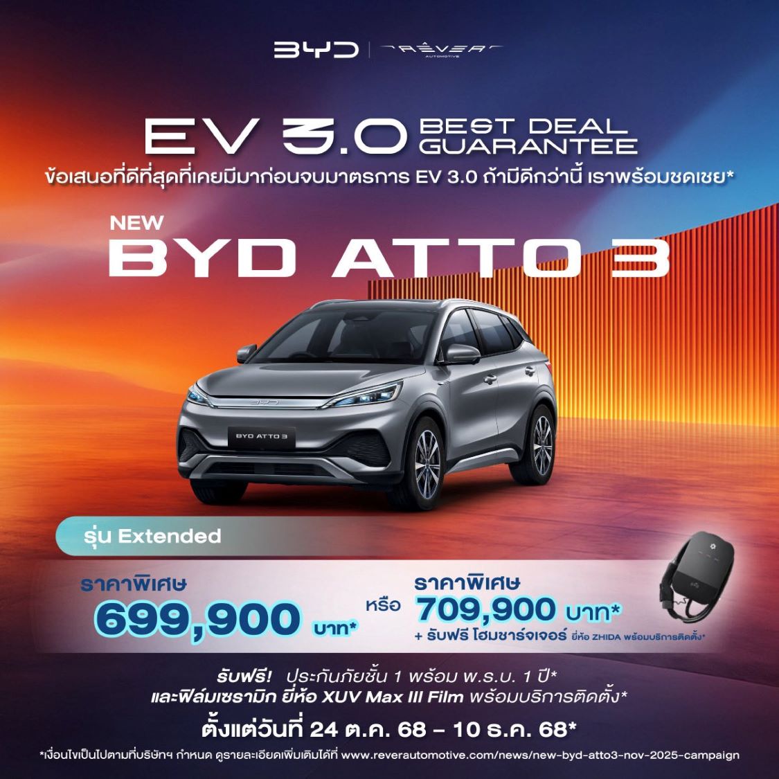 บีวายดี ประเทศไทย และเรเว่ ตั้งราคาใหม่รถ BYD DOLPHIN และ BYD ATTO 3 ลดราคาลง 40,000-200,000 บาท รับมาตรการ EV3.0 ที่จะสิ้นสุดในวันที่ 31 ธันวาคม 2568 นี้