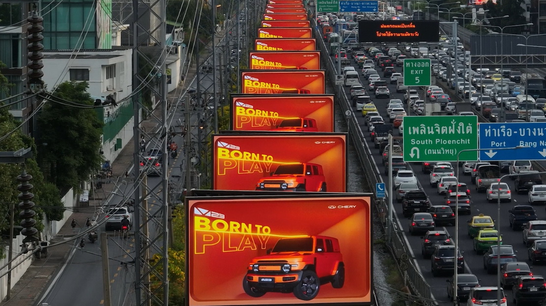 ความพิเศษของการสื่อสารด้วยสื่อโฆษณานอกบ้านให้เป็นเครื่องมือเชิงกลยุทธ์ของ CHERY ในครั้งนี้ คือ การสร้างมิติใหม่ของการโปรโมตรถยนต์ ให้มากกว่าขาย แต่ใช้ความครีเอทีฟดึงดูดสายตาด้วยดีไซน์รถสีส้มสดใส และมุมมองภาพเคลื่อนไหวเสมือนจริง ถ่ายทอดคอนเซ็ปต์ “Born to Play” บนจอ Parc Paragon The 90 Degree และ Interchange 21 - แลนด์มาร์กสำคัญที่สร้างการมองเห็นและไวรัลได้อย่างกว้างขวาง ทำให้เกิดการแชร์ต่อ อีกทั้งยังยึดพื้นที่บริเวณทางด่วนพระราม 4 ด้วย “The 20” ชุดจอดิจิทัลที่เรียงกัน 37 ต้น 74 จอ ระยะทางยาวกว่า 2.5 กิโลเมตร นับเป็นการสร้างปรากฏการณ์ครั้งสำคัญที่เปลี่ยนถนนทั้งสายให้กลายเป็นรันเวย์ของ CHERY V23 เพิ่มโอกาสในการเข้าถึงกลุ่มคนเมืองรุ่นใหม่ได้อย่างครอบคลุมทุก Touch Point