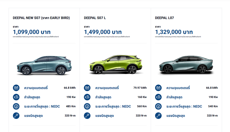 ค่าย CHANGAN ได้เปิดตัว DEEPAL NEW S07 ในราคาคาดการณ์ 1,219,000 บาท พร้อมข้อเสนอพิเศษช่วงเปิดตัวในราคา 1,099,000 บาท สามารถศึกษารายละเอียดเพิ่มเติมได้ที่ https://www.changan.co.th/th/promotion/
