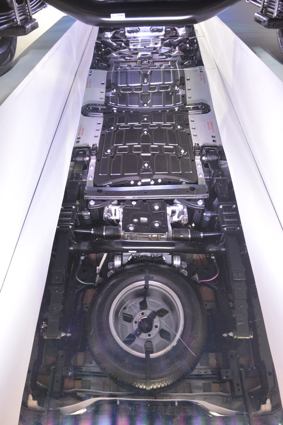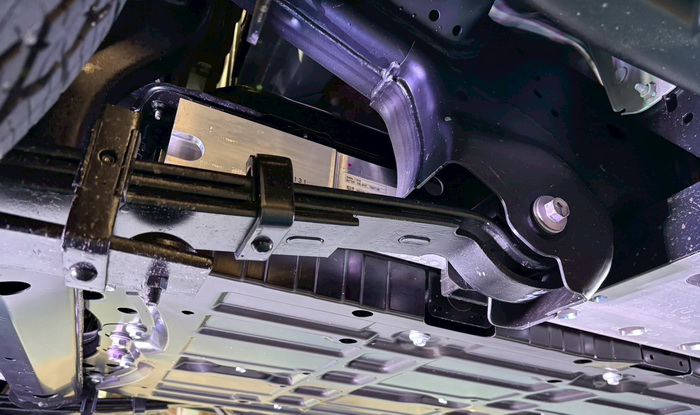 โครงสร้างโดยหลักเป็น แผ่นเหล็กและอะลูมิเนียมเสริมแรง (Reinforced Underbody Plates) ที่ติดตั้งทั้ง ด้านหน้า (ป้องกันการกระแทกจากเศษหิน, ขอนไม้, ทางลาดชัน) ใต้ท้องกลาง (บริเวณแบตเตอรี่หลัก) และแนวข้าง (ด้านข้างซ้าย-ขวา เพื่อกันหินกระเด็นหรือแรงกระแทกเฉียง) มี “โครงค้ำแบบสามเหลี่ยม” (Diamond Reinforcement) ที่ช่วยกระจายแรงกระแทกออกจากจุดศูนย์กลางแบตเตอรี่ไปยังโครงหลักของรถ