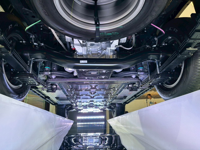 “ระบบช่วงล่างหลังของ Hilux Travo-e ไม่ได้ใช้แหนบแบบกระบะทั่วไปแล้ว แต่มาแนวฉลาดกว่านั้น — Toyota ใช้แบบ De-Dion ที่แยกมอเตอร์หลังออกจากคาน ทำให้ล้อหลังเบา เด้งน้อย แต่ยังลุยได้เหมือนเดิม ให้ฟีลคล้าย SUV มากกว่ากระบะเครื่องดีเซลเดิมซะอีก!”