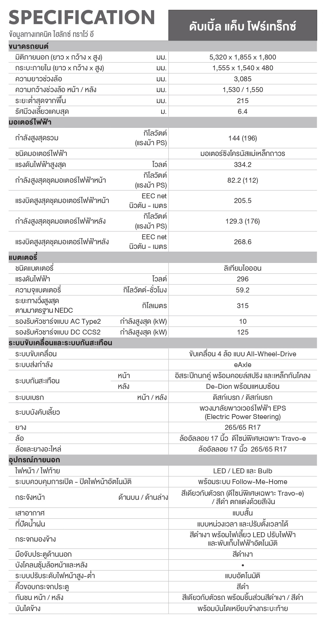 แพลตฟอร์ม: Travo-e ใช้โครงสร้าง Body-on-Frame แบบใหม่ ที่ออกแบบให้วางแบตเตอรี่ไว้ตรงกลางโครงแชสซีเพื่อลดจุดศูนย์ถ่วง และเพิ่มความแข็งแรงในการบิดตัว แบตเตอรี่จะมี “อลูมิเนียมโปรเทคชั่นเคส” เพื่อกันแรงกระแทกตอนใช้งานในเส้นทางออฟโรด