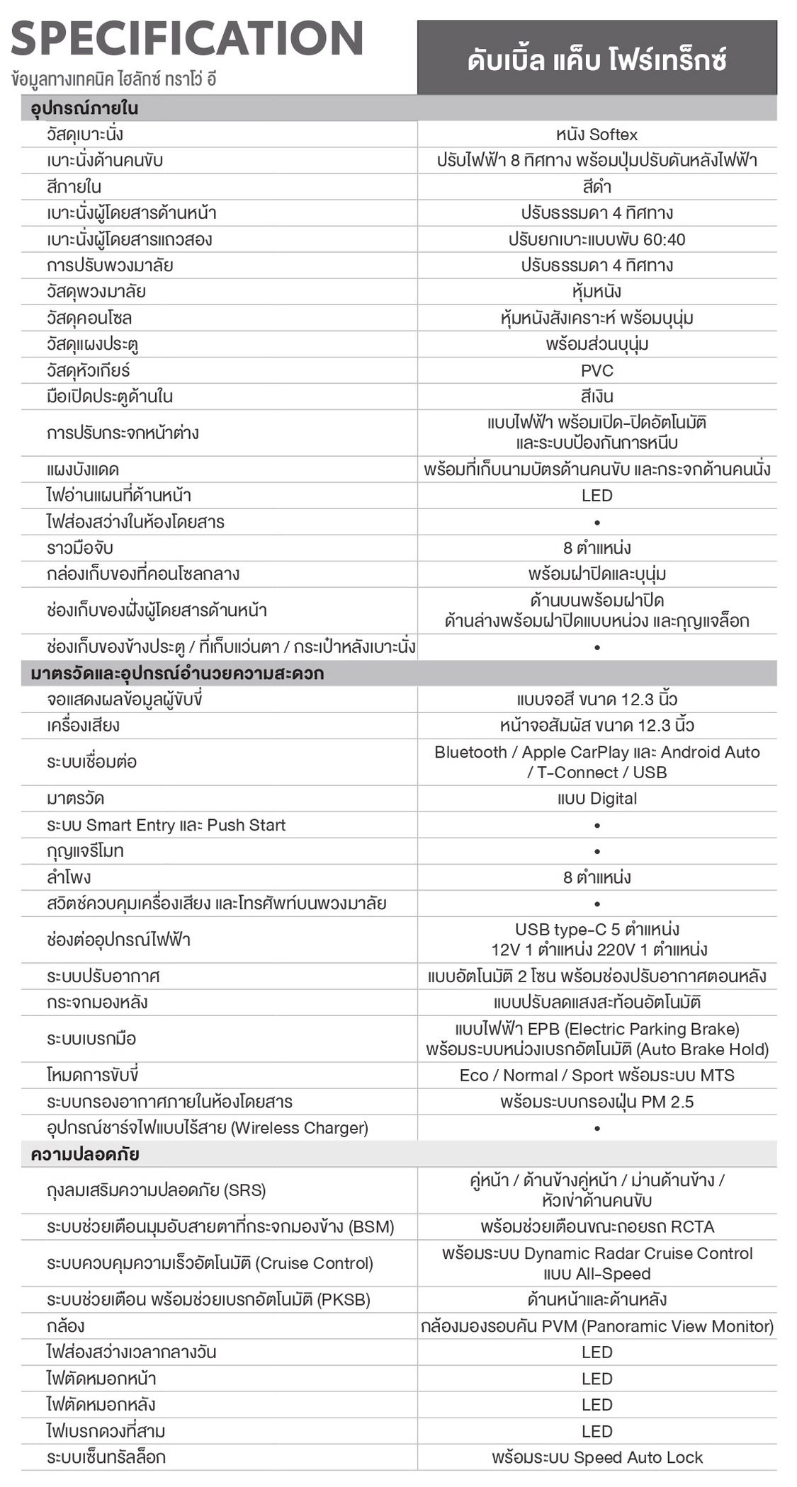 ดีไซน์ภายใน: หน้าจอกลางขนาด 12.3” จอคนขับ 7” พร้อมโหมด EV โดยเฉพาะ คันเกียร์แบบ Shift-by-wire, ระบบแอร์ Dual Zone, ที่ชาร์จไร้สาย 15W ใช้วัสดุ Soft-touch มากขึ้น แต่ยังคงโทน “ลุย-พรีเมียม”