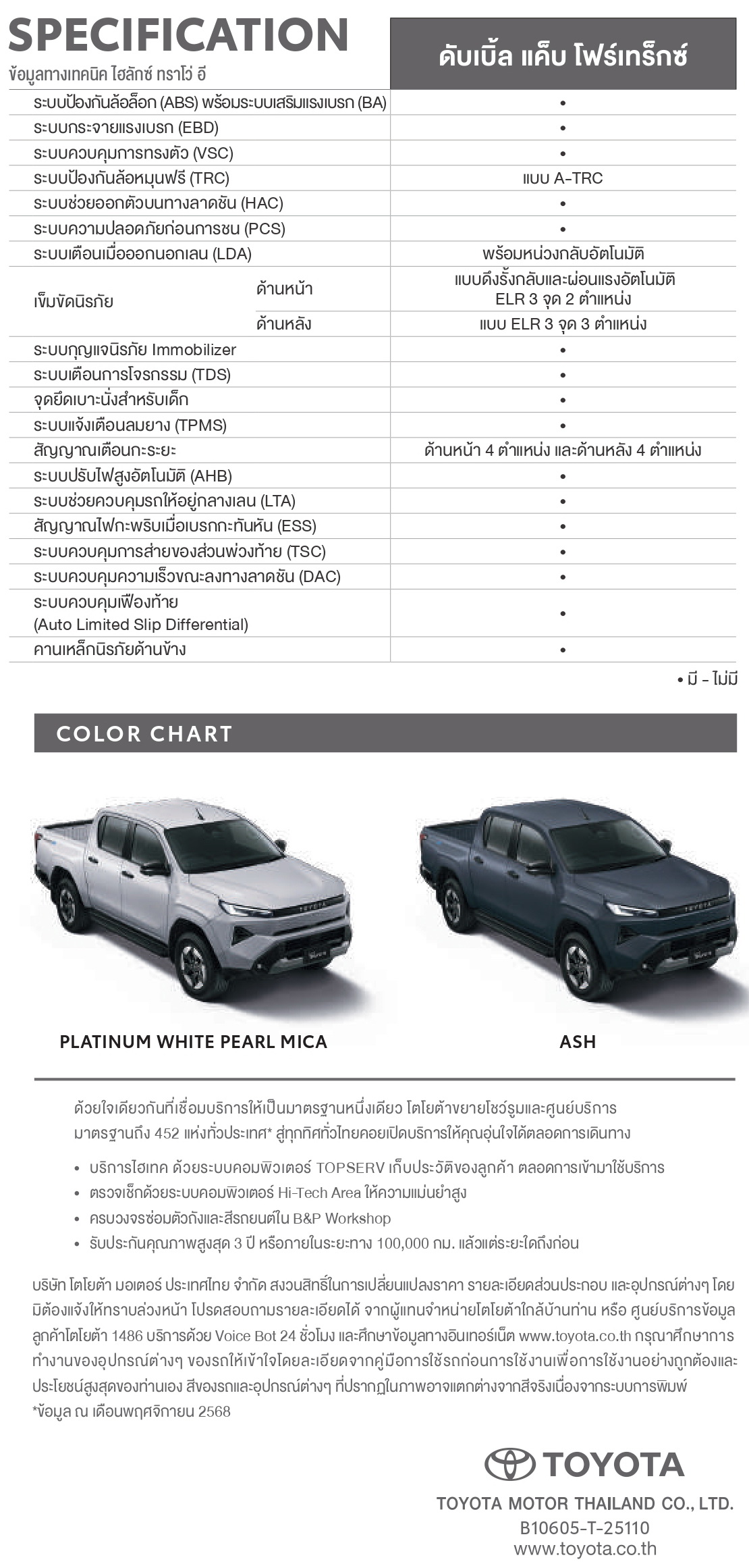 “Toyota ไม่ได้เปิดตัว Hilux EV เพื่อทดสอบตลาด แต่เปิดเกมด้วยรุ่นท็อปสุด — Double Cab 4TREX — เพราะมั่นใจพอจะโชว์ทุกระบบตั้งแต่วันแรก จากนี้รุ่นย่อยที่ตามมาจะง่ายขึ้น เพราะคนเห็นแล้วว่า EV ของ Toyota “ลุยได้จริง”