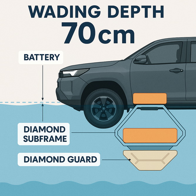 สรุปสั้น ๆ: ระยะต่ำสุดเป็นค่ากายภาพพื้นฐาน แต่ wading depth มากกว่า ground clearance หมายความว่าโตโยต้าออกแบบให้ชิ้นส่วนสำคัญ (แบต, มอเตอร์, ECU, คอนเน็กเตอร์ ฯลฯ) กันน้ำได้และ/หรือยกให้สูงกว่าจุดที่น้ำมาถึง