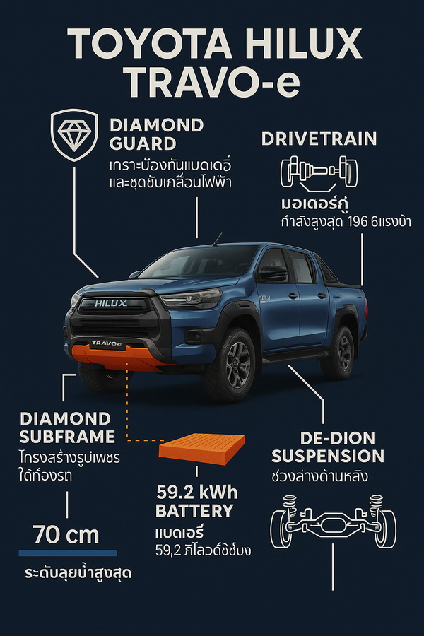 สิ่งที่ Toyota เรียกว่า “DIAMOND GUARD” คือ “ตัวต่อชิ้นสุดท้าย” ของจิ๊กซอว์ด้านวิศวกรรมของ Hilux Travo-e ที่ทำให้รถคันนี้ “ลุยได้จริงโดยไม่ต้องกลัวแบตฯพัง”