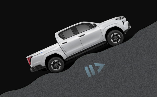 มุมเหล่านี้อยู่ในระดับเดียวกับ Hilux Revo Rocco เดิม แต่ได้เปรียบตรงที่ศูนย์ถ่วงต่ำกว่าเพราะวางแบตฯอยู่กลางล่าง แปลว่า “มันจะนิ่งกว่าเวลาปีนป่ายเนิน” และ “รถจะเอียงน้อยกว่าเวลาขับลงทางชัน”