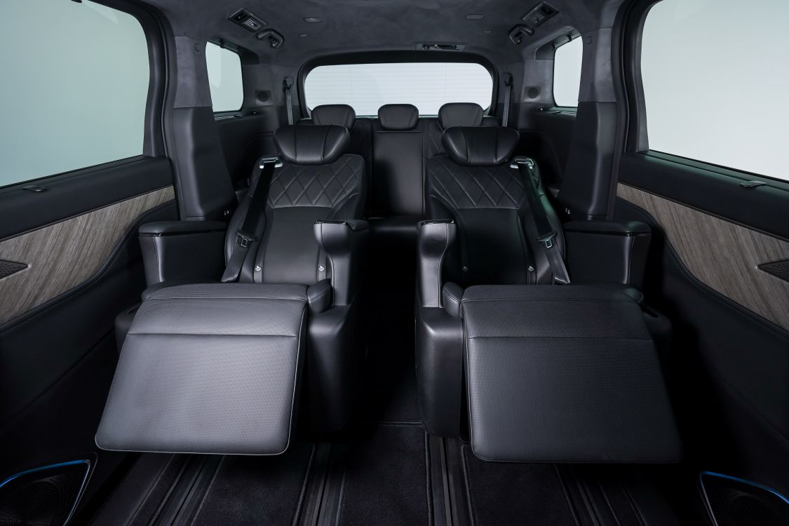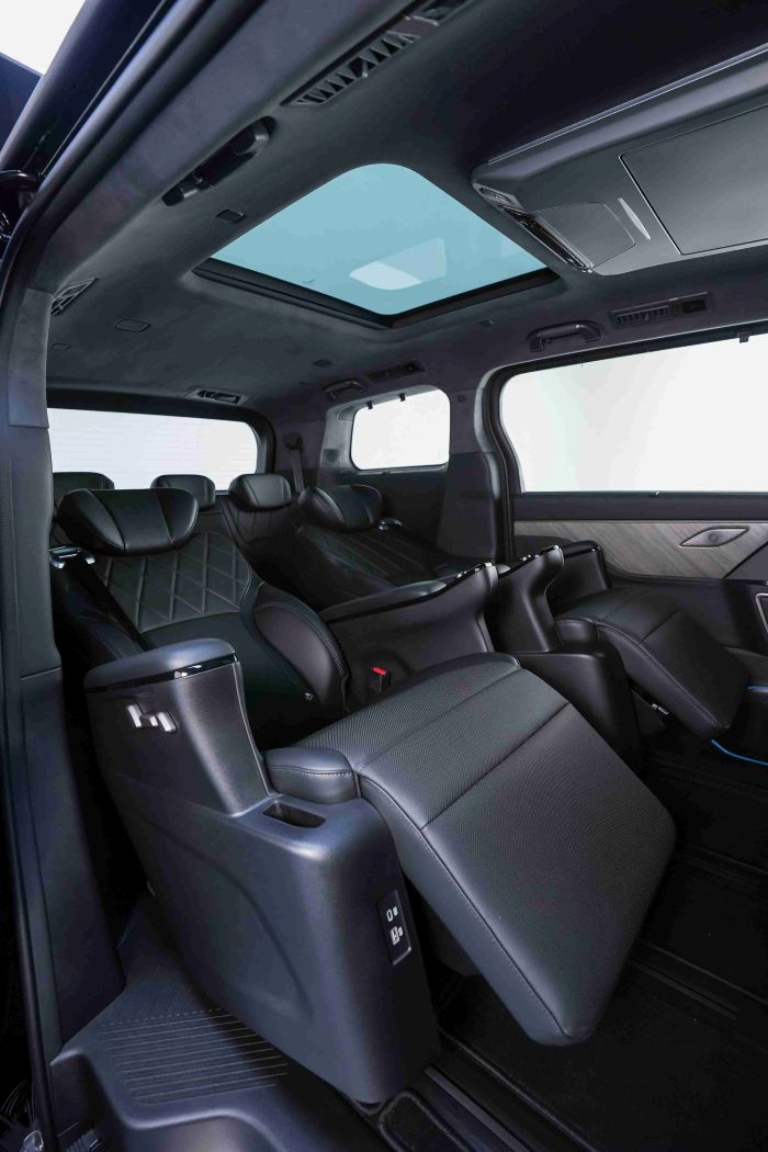 ด้านการออกแบบภายในเน้นความโปร่งโล่ง เดินได้สะดวกสบายด้วยความสูงภายใน 1,277 มม. ขณะที่ช่องทางเดินกลางกว้างถึง 170 มม. หรูหราด้วยวัสดุหนัง NAPPA สัมผัสนุ่ม หรูหรา ทนทาน ไม่ระคายเคืองผิว ระบายอากาศได้ดี และทำความสะอาดง่าย การออกแบบเบาะนั่งได้รับแรงบันดาลใจจากเทคโนโลยีการบินและอวกาศของ NASA เบาะแถวสองแบบ Zero-Gravity ทำให้ผู้โดยสารแถวสองรู้สึกสบายเหมือนนั่งอยู่ในอวกาศที่ปราศจากแรงโน้มถ่วง สามารถปรับองศาเบาะให้อยู่ใน “Golden Angle” ซึ่งเป็นมุมที่เหมาะสมที่สุดสำหรับสรีระมนุษย์ โดยมีมุมลำตัวที่ 127° และมุมต้นขา-น่องที่ 132° พร้อมจัดตำแหน่งหัวใจและหัวเข่าให้อยู่ในระดับเดียวกัน เพื่อช่วยกระจายแรงกดทั่วเบาะอย่างสมดุล โดยร่างกายของผู้โดยสารไม่ได้สัมผัสกับชิ้นส่วนหรือพื้นของรถ ลดแรงกดทับ ลดความเมื่อยล้า และเพิ่มความผ่อนคลายในการโดยสาร ทั้งยังมาพร้อมระบบเบาะนวดไฟฟ้า 6 รูปแบบ และระบบเบาะระบายอากาศที่พนักพิงและที่นั่ง มอบความผ่อนคลายขั้นสุดตลอดการเดินทาง