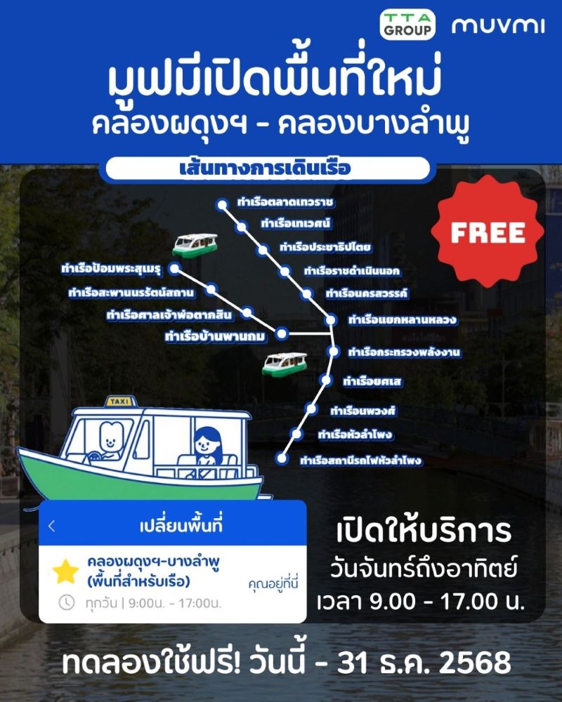 มูฟมี “MuvMi” เปิดให้บริการเรือแท็กซี่ไฟฟ้าฟรี! เส้นทางคลองผดุงกรุงเกษม-คลองบางลำพู ช่วงเวลา 09:00 – 17:00 น.เริ่มตั้งแต่วันนี้-31 ธ.ค.2568
