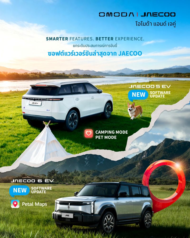 OMODA & JAECOO อัพเลเวล JAECOO 6 EV ด้วย Petal Maps ฟีเจอร์นำทางขั้นสูงและเน้นความเป็นส่วนตัว ช่วยนำทางแบบละเอียด เลี้ยวต่อเลี้ยว เลนต่อเลน ด้วยข้อมูลเรียลไทม์ และอัปเดตซอฟต์แวร์ใหม่ให้ JAECOO 5 EV รองรับฟังก์ชัน Camping Mode และ Pet Mode สำหรับสายเอาท์ดอร์และบรรดาทาสฯ
