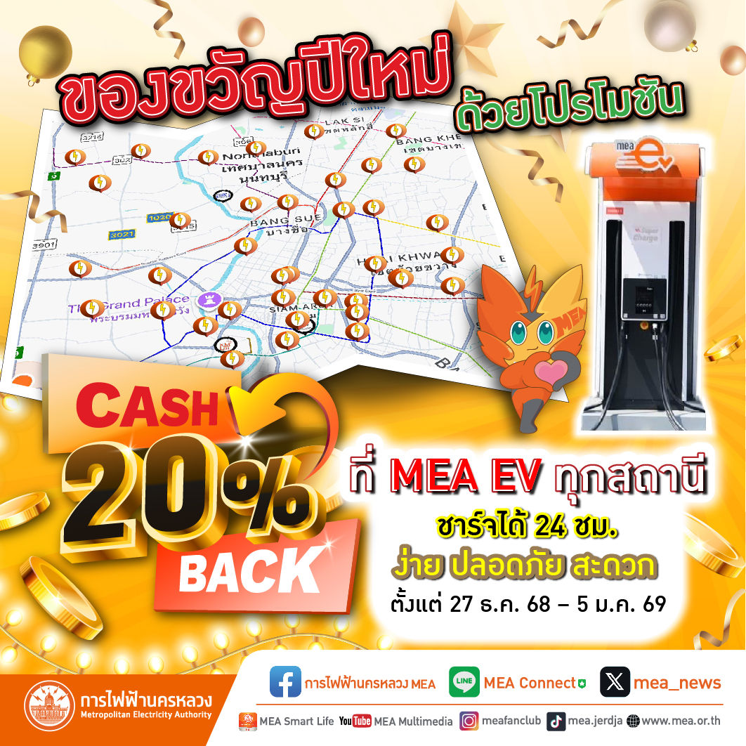 เมื่อชาร์จรถไฟฟ้าที่สถานีชาร์จของการไฟฟ้านครหลวง MEA EV ตามวันและเวลาที่กําหนด MEA จะมอบเงินคืน 20% จากการใช้บริการ โดยระบบจะโอนเงินเข้า MEA EV Wallet ภายในวันที่ 15 มกราคม 2569 และแจ้งลูกค้าทางอีเมล