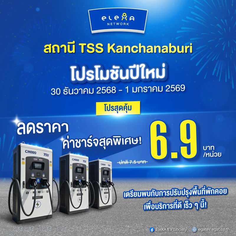 สถานี TSS Kanchanaburi ลดราคาค่าชาร์จเหลือ 6.9 บาท/kWh ราคานี้เริ่มใช้ได้ ตั้งแต่วันที่ 30 ธันวาคม 2568 - 1 มกราคม 2569 ตลอด 24 ชั่วโมง
