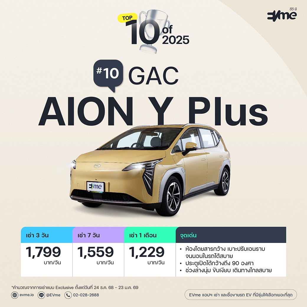 10.GAC AION Y PLUS จุดเด่น : ห้องโดยสารกว้าง ประตูเปิดได้ 90 องศา ช่วงล่างนุ่ม เหมาะกับเดินทางไกล