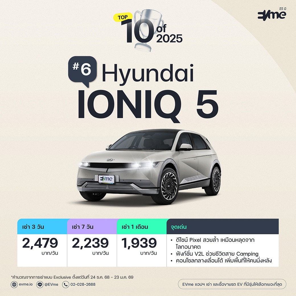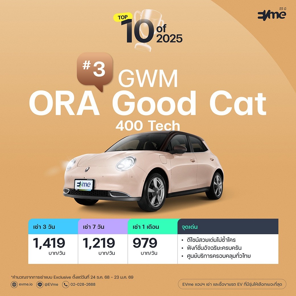 EVme เปิดโผ 10 อันดับรถ EV ยอดฮิตประจำปี 2025 ที่มีลูกค้าเช่ามากที่สุด ปรากฏว่า TESLA MODEL 3 Standard Range ทำสถิติสูงสุดอันดับ 1 โดย Tesla ทุกรุ่นรวมกันมียอดบุ๊คกิ้งกว่า 6,550 Bookings รถยนต์ไฟฟ้ารุ่นยอดนิยมอันดับ 2 คือ BYD DOLPHIN Standard Range และอันดับ 3 คือ GWM ORA GOOD CAT 400 TECH