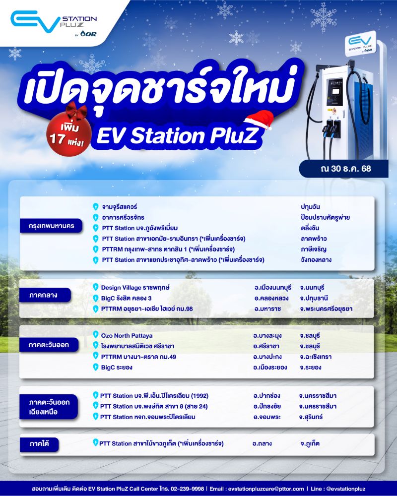 EV Station PluZ เปิดจุดชาร์จเพิ่ม 17 แห่งส่งท้ายปี