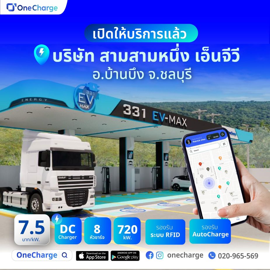 สถานีชาร์จรถยนต์ไฟฟ้า 331 – EV MAX ให้บริการด้วยเครื่องชาร์จ Huawei Ultra Fast Charge กำลังไฟสูงสุด 720 kW จำนวน 8 หัวชาร์จ รองรับทั้งรถยนต์ไฟฟ้า รถไฟฟ้าเชิงพาณิชย์ และรถบรรทุกไฟฟ้า มีลานจอดกว้างขวาง เข้า–ออกง่าย ค่าชาร์จ 7.5 บาท / kWh ใช้งานผ่านแอพฯ OneCharge เปิดให้บริการ 24 ชั่วโมง ตั้งแต่ต้นปีที่ผ่านมา