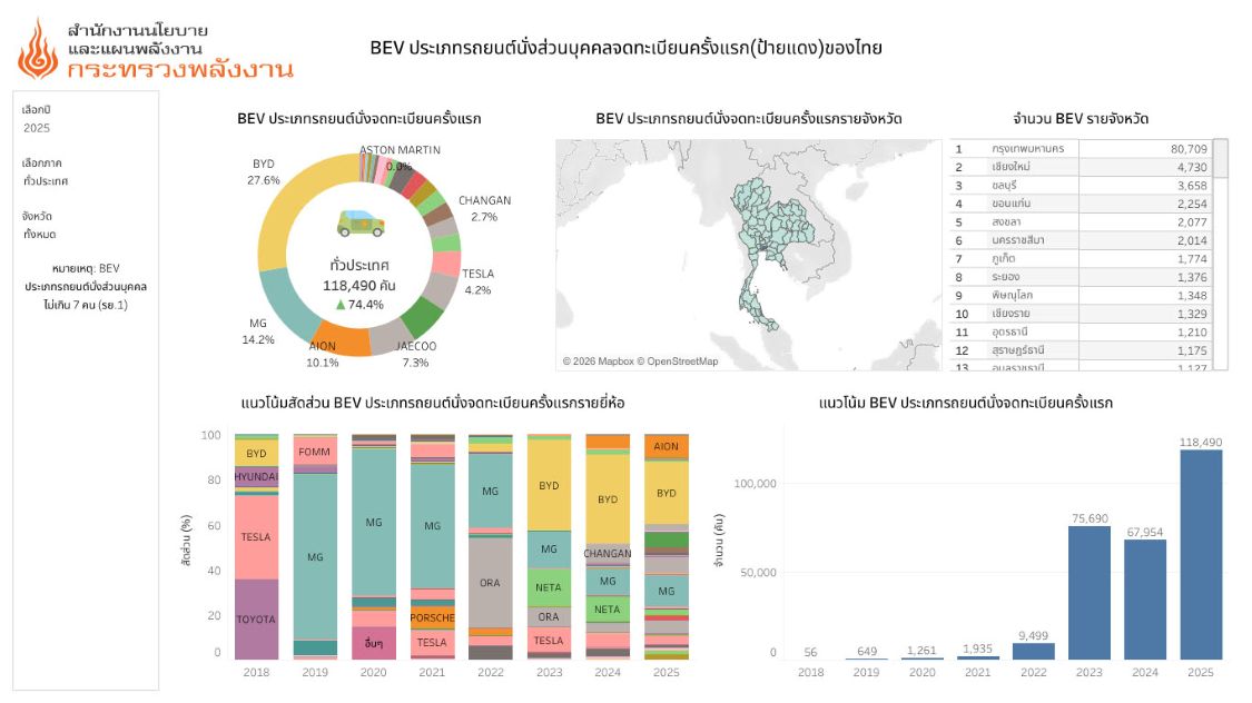 สนพ. เผยสถิติยอดจดทะเบียนรถยนต์ไฟฟ้า ปี 2568 ระหว่าง ม.ค.- ธ.ค. 2568 โตทุกเซ็กเมนต์ BEV กวาดไป 147,571 คัน สูงกว่าปี 2567 ถึง 50,835 คัน ส่งผลให้ยอดจดทะเบียนสะสมรถยนต์ไฟฟ้า 100% หรือ BEV ในประเทศไทย ณ วันที่ 31 ธันวาคม 2568 มีทั้งสิ้น 372,703 คัน BYD แชมป์ยอดจดทะเบียนเก๋ง EV ป้ายแดง กินแชร์ตลาดกว่า 27.6% หรือประมาณ 33,891 คัน