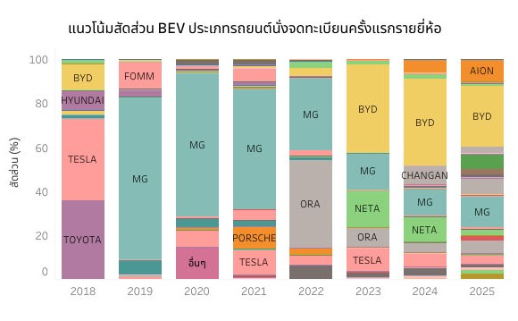BYD ครองแชมป์ยอดจดทะเบียนเก๋ง EV ป้ายแดง ปี 2568 โดยกินแชร์ตลาดกว่า 27.6% หรือประมาณ 33,891 คัน ยังรักษาส่วนแบ่งตลาดไว้ได้อย่างเหนียวแน่นในช่วง 3 ปีที่ผ่านมา เช่นเดียวกับค่าย MG ที่มีส่วนแบ่งตลาดระดับ 14-15% มา 3 ปีต่อเนื่อง ส่วนน้องใหม่มาแรงแซงโค้งคือแบรนด์ JAECOO ที่แบ่งแชร์ตลาดไปได้ถึง 7.3% ทั้งที่เข้าเพิ่งเข้ามาทำตลาด สามารถแซงค่ายเทสลาขึ้นไปอยู่อันดับ 4 ของตลาดในปีนี้ อันดับ 5.TESLA มีส่วนแบ่งตลาด 2.7% แต่เป็นหนึ่งในไม่กี่ค่ายที่ยืนหยัดอยู่ในตลาดได้อย่างเหนียวแน่น ไม่หายหน้าไปไหน