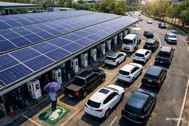 การเลือกสถานี: จากนี้ไป "หลังคาโซลาร์" บนสถานีชาร์จไม่ใช่แค่เรื่องความสวยงาม แต่มันคือ "สัญลักษณ์ของค่าชาร์จราคาถูก" ในช่วงกลางวัน