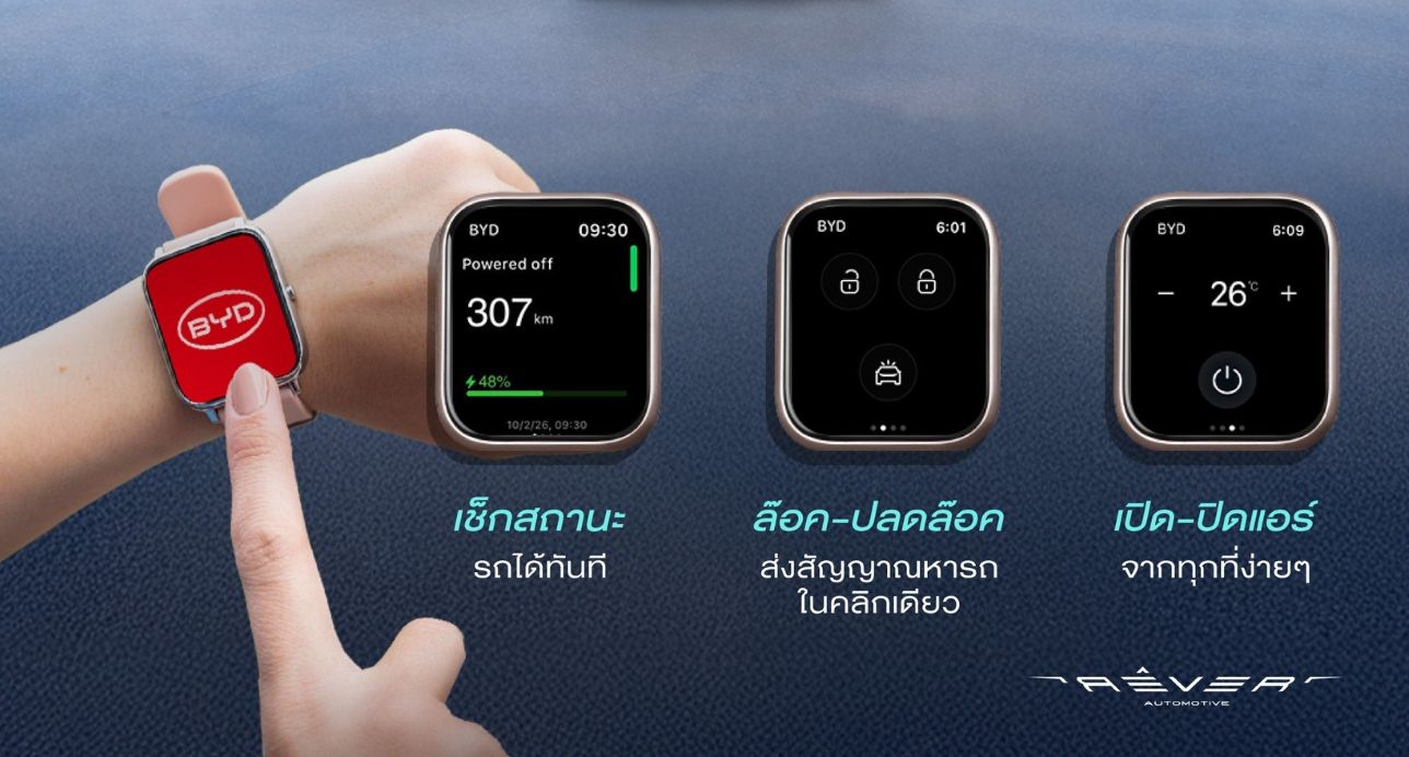 อัปเดตล่าสุดของ BYD SUPER APP สามารถควบคุมรถผ่านสมาร์ท วอทช์ เพื่อตรวจเช็คระดับแบตเตอรี่ ดูระยะทางวิ่งคงเหลือ ค้นหาตำแหน่งรถ สั่งล็อก–ปลดล็อก และเปิดแอร์ล่วงหน้า “จากข้อมือ”