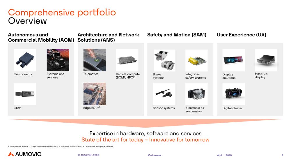 การเปิดตัวในครั้งนี้ AUMOVIO ได้นำเสนอพอร์ตโฟลิโอเทคโนโลยียานยนต์แบบครบวงจร ครอบคลุมทั้งฮาร์ดแวร์ ซอฟต์แวร์ และบริการสำหรับอุตสาหกรรมยานยนต์ โดยแบ่งการดำเนินธุรกิจออกเป็น 4 กลุ่มหลัก ได้แก่