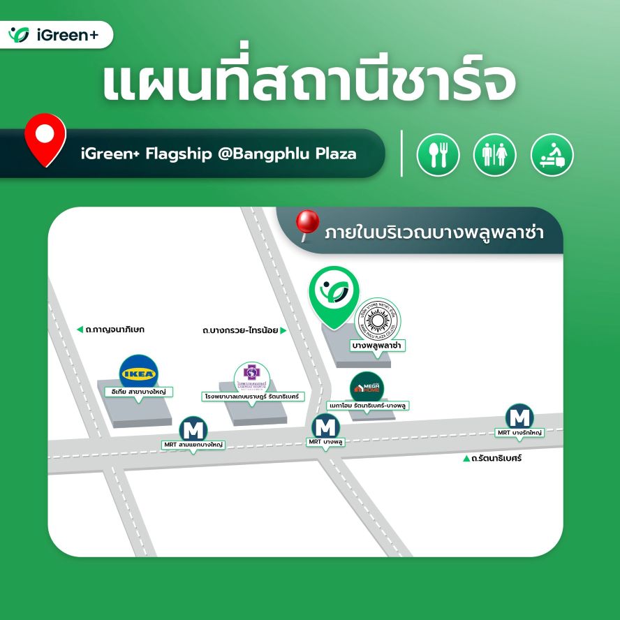 iGreen+ เปิดสถานีชาร์จ “iGreen+ Flagship@Bangphlu Plaza” สถานีระดับ Flagship ย่านนนทบุรี ที่ บางพลูพลาซ่า เป็นสถานีชาร์จเวอร์ชั่นใหม่ ใหญ่ ทันสมัย พร้อมร้านสะดวกซื้อ ร้านอาหาร ร้านนวด สปา ห้องน้ำ ไม่ต่างจากปั๊มน้ำมัน จัดเต็มเครื่องชาร์จ DC FASTCHARGE มากถึง 12 หัวชาร์จ เป็นเครื่องชาร์จ DC 120 kW จำนวน 4 เครื่อง 8 หัวชาร์จ และ DC 240 kW จำนวน 2 เครื่อง 4 หัวชาร์จ