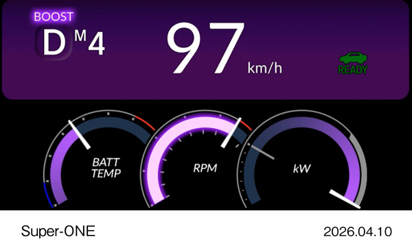 หน้าปัดดิจิทัลแบบ triple-gauge แสดงอุณหภูมิแบตเตอรี่ รอบเครื่องยนต์จำลอง และกำลังไฟ โดยออกแบบให้คล้ายมาตรวัดแบบอะนาล็อก