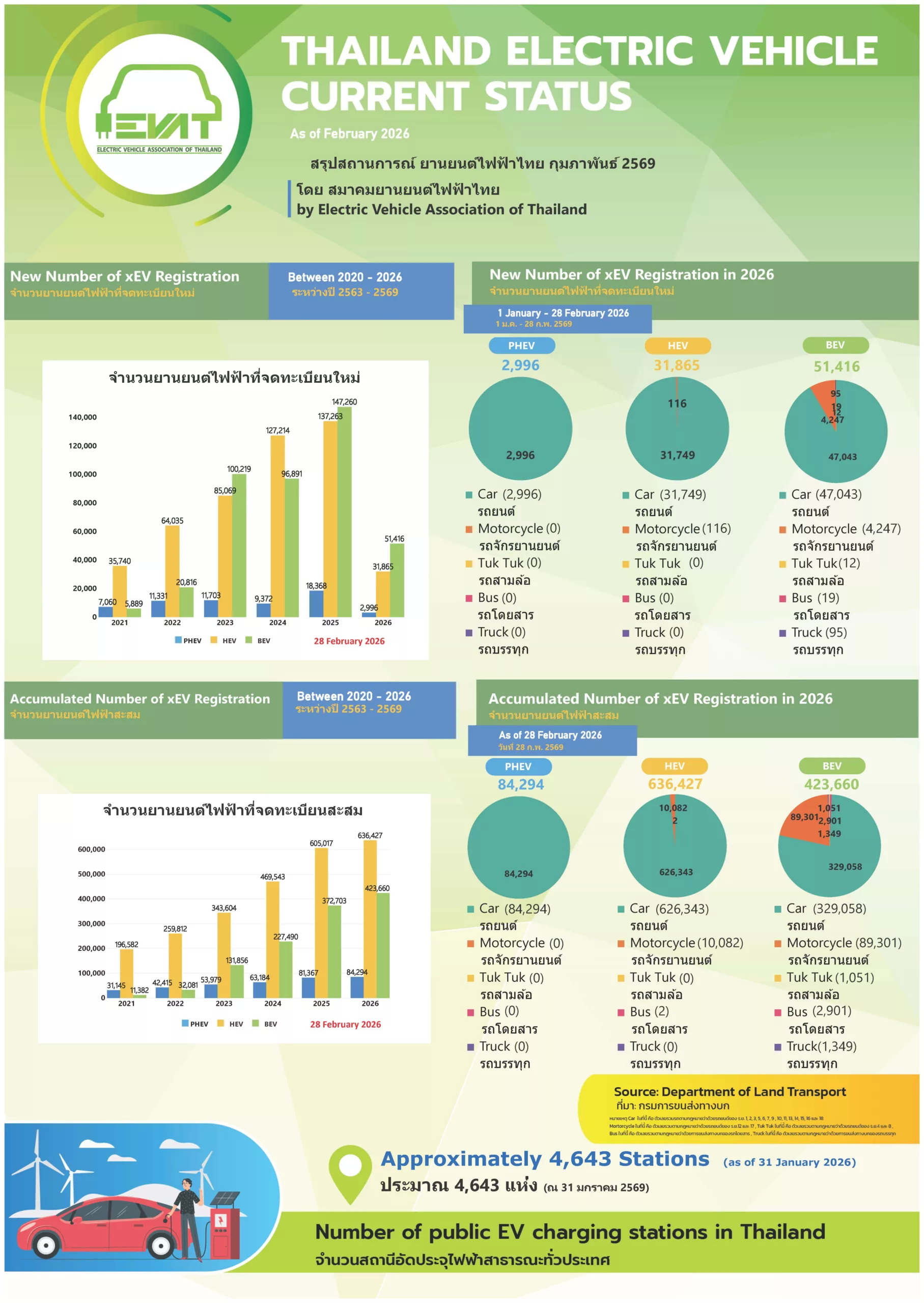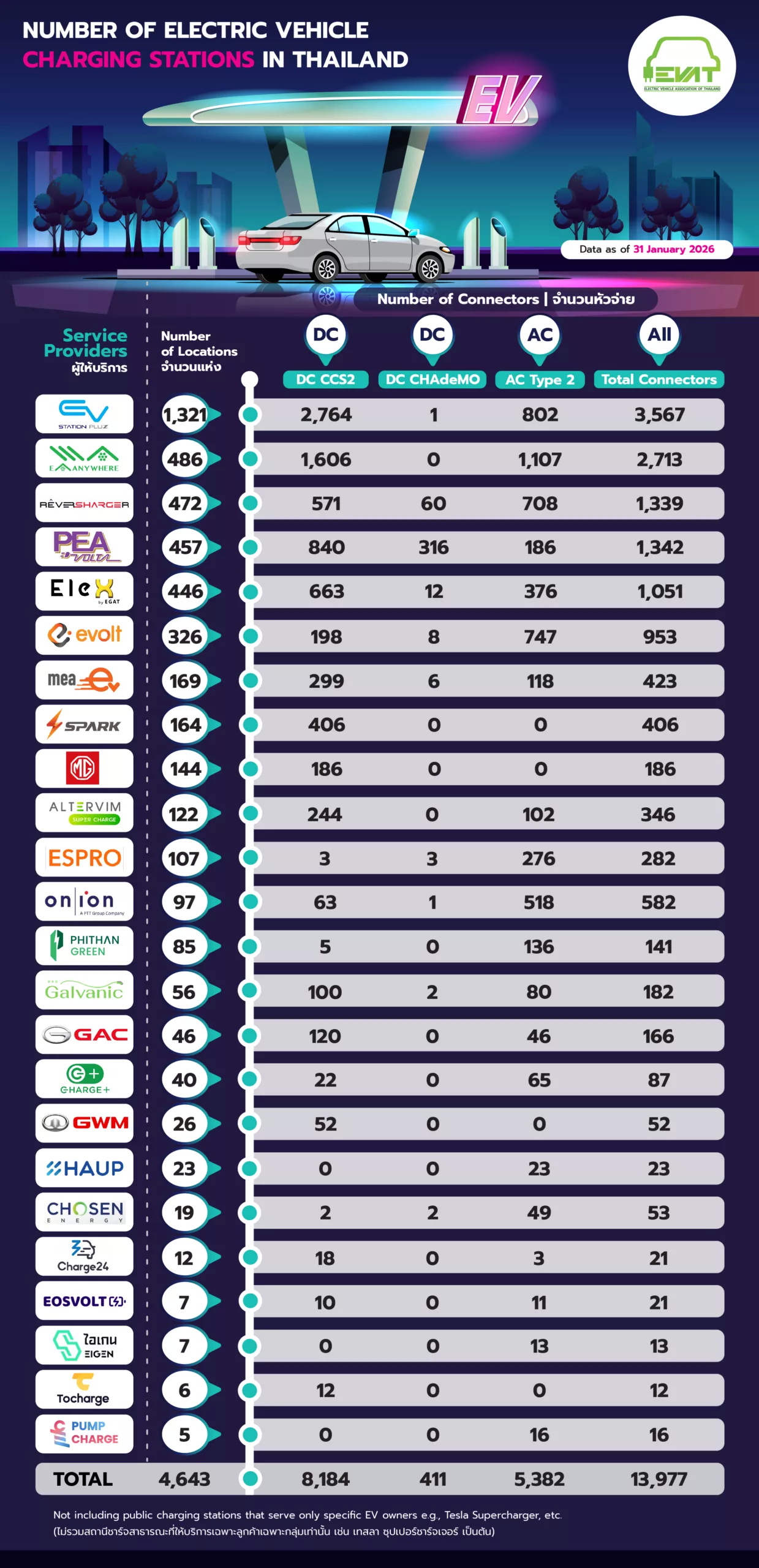ส่วนจำนวนสถานีชาร์จ EV ในไทย อัพเดตล่าสุด เปิดสะสมแล้ว 4,643 สถานี จากผู้ให้บริการ 23 แบรนด์ มีหัวชาร์จรวม 13,977 หัวชาร์จ แยกเป็นหัวชาร์จ DC CCS2 จำนวน 8,184 หัวชาร์จ หัวชาร์จแบบ DC CHAdeMO จำนวน 411 หัวชาร์จ หัวชาร์จแบบ AC Type 2 จำนวน 5,382 หัวชาร์จ (ข้อมูลจาก สมาคมยานยนต์ไฟฟ้าไทย (EVAT) ณ วันที่ 31 มกราคม 2569)