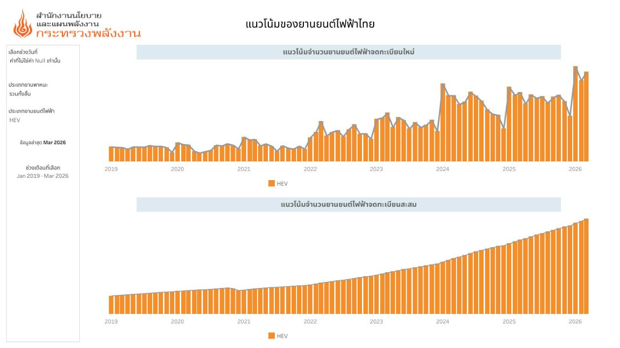 ยอดจดทะเบียนยานยนต์ไฟฟ้า ประเภทประเภทไฟฟ้าผสม (HEV : Hybrid Electric Vehicle) ปี 2569 ตั้งแต่ 1 มกราคม 2568 ถึง 31 มีนาคม 2569 มีจำนวนทั้งสิ้น 48,161 คัน แยกเป็น