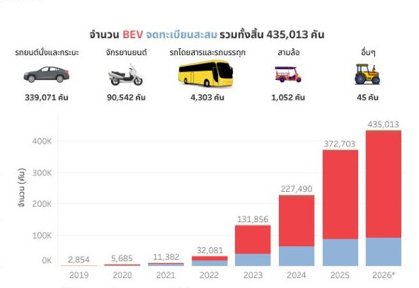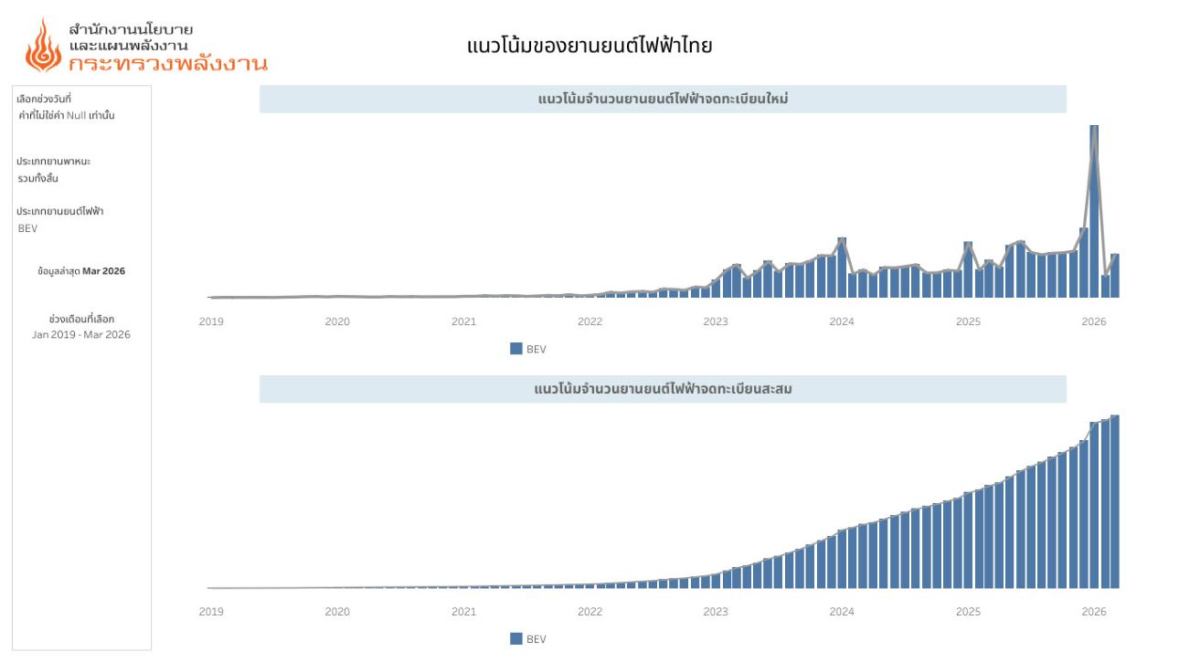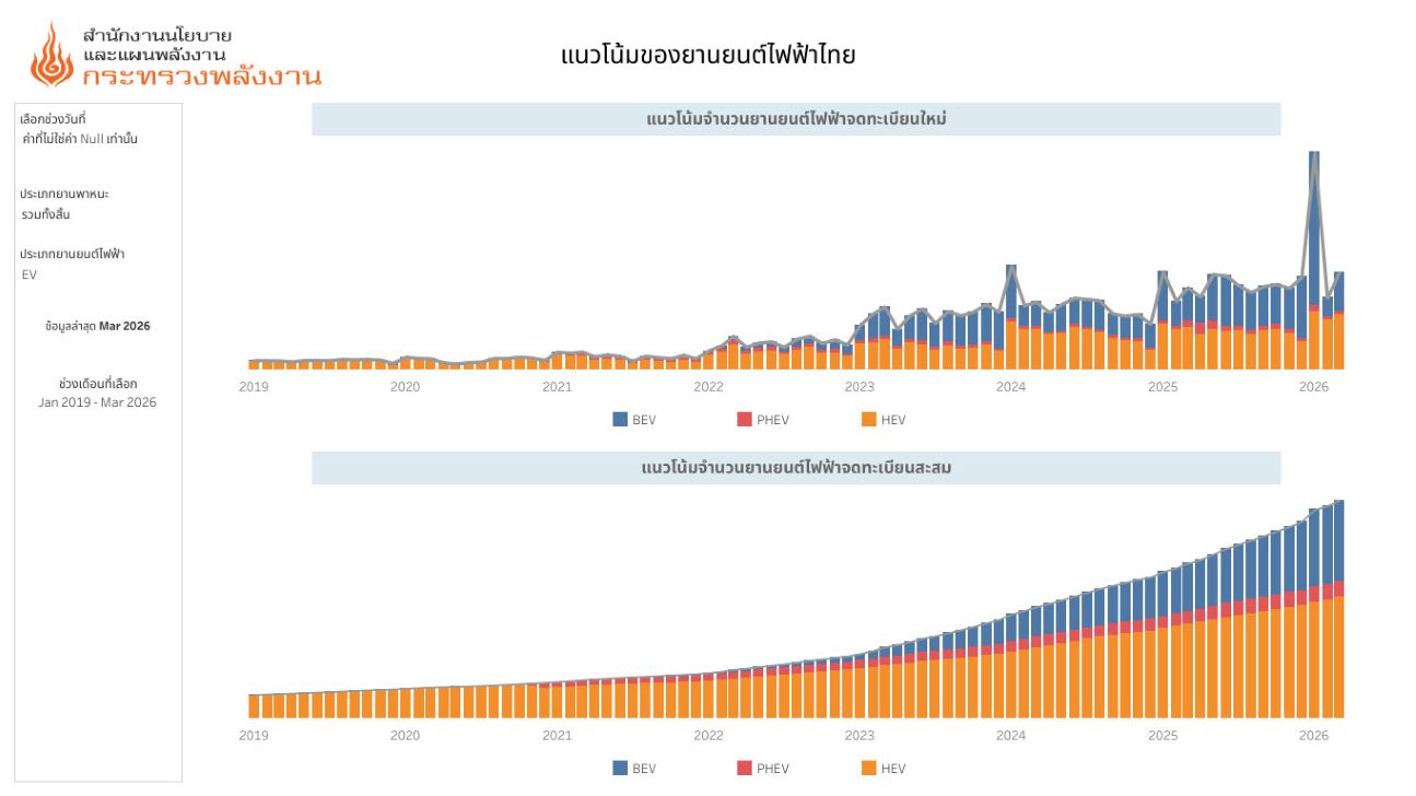 สนพ. อัพเดตยอดจดทะเบียน EV ล่าสุด 3 เดือนแรกของปี 2569 (1 ม.ค.- 31 มี.ค. 2569) มียอดจดทะเบียนใหม่รถยนต์นั่งและกระบะ BEV พุ่ง 57,235 คัน ขณะที่รถยนต์นั่งไฟฟ้าและกระบะไฟฟ้าผสม (HEV) มียอดจดทะเบียนใหม่ 47,971 คัน "เป็นครั้งแรกที่รถไฟฟ้าล้วนทำยอดจดทะเบียนป้ายแดงแซง HEV" ด้วยยอดจดทะเบียนใหม่ที่แตกต่างกันถึง 9,264 คัน ดันยอดจดทะเบียนสะสมเก๋งและกระบะไฟฟ้า 100% ทำสถิติใหม่ที่ 339,071 คัน!