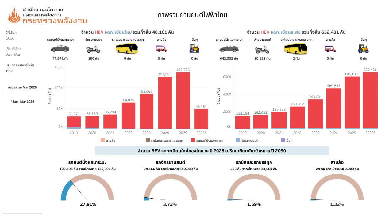 ยอดจดทะเบียนสะสมยานยนต์ไฟฟ้าประเภทไฟฟ้าผสม (HEV) ณ วันที่ 31 มีนาคม 2569 มีจำนวนทั้งสิ้น 652,431 คัน แยกเป็น