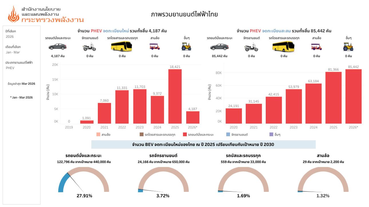 ยอดจดทะเบียนสะสมยานยนต์ไฟฟ้าประเภทไฟฟ้าผสมแบบเสียบปลั๊ก (PHEV) ณ วันที่ 31 มีนาคม 2569 มีจำนวน 85,442 คัน แยกเป็น