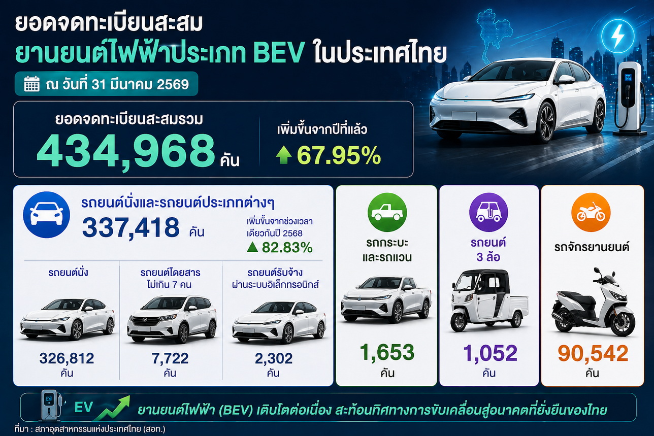 ณ วันที่ 31 มีนาคม 2569 ยานยนต์ไฟฟ้าจดทะเบียนสะสมประเภท BEV มีจำนวนทั้งสิ้น 434,968 คัน เพิ่มขึ้นจากปีที่แล้วร้อยละ 67.95 โดยแบ่งประเภทได้ ดังนี้