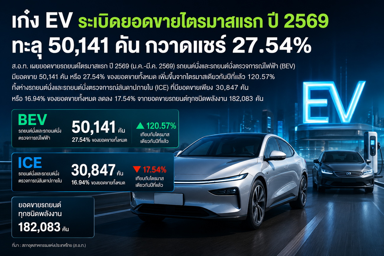 ส.อ.ท. เผยยอดขายรถยนต์ไตรมาสแรก ปี 2569 (ม.ค.-มี.ค. 2569) รถยนต์นั่งและรถยนต์นั่งตรวจการณ์ไฟฟ้า (BEV) มียอดขาย 50,141 คัน หรือ 27.54% ของยอดขายทั้งหมด เพิ่มขึ้นจากไตรมาสเดียวกันปีที่แล้ว 120.57% ทิ้งห่างรถยนต์นั่งและรถยนต์นั่งตรวจการณ์สันดาปภายใน (ICE) ที่มียอดขายเพียง 30,847 คัน หรือ 16.94% ของยอดขายทั้งหมด ลดลง 17.54% จากยอดขายรถยนต์ทุกชนิดพลังงาน 182,083 คัน คาด เม.ย. ยังแรงต่อเนื่อง