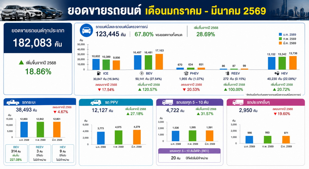 ตั้งแต่เดือนมกราคม - มีนาคม 2569 รถยนต์มียอดขาย 182,083 คัน