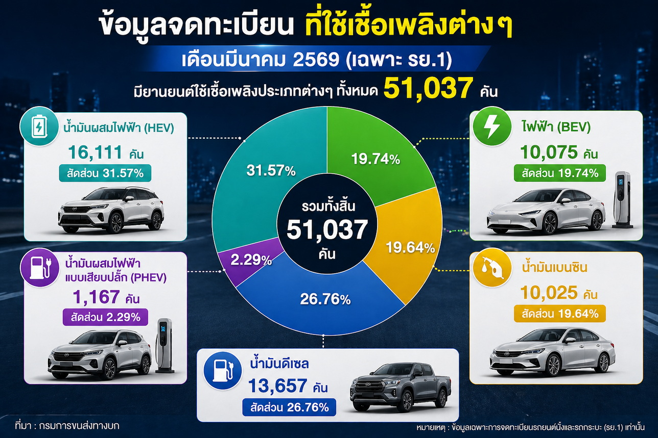 เดือนมีนาคม 2569 มียานยนต์ใช้เชื้อเพลิงประเภทต่างๆ จำนวน 51,037 คัน โดยแบ่งเป็น