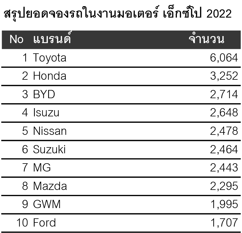 นอกจากนี้ ยังสามารถยืนยันกระแสความฮอตของรถยนต์ไฟฟ้าได้จากยอดจองรถยนต์ในงานมอเตอร์ เอ็กซ์โป 2022 ค่ายรถยนต์ไฟฟ้าอย่าง BYD มียอดจองสูงถึง 2,714 คัน มากเป็นอันดับ 3 คือเป็นรองจากโตโยตา ที่มียอดรถยนต์รวมทั้งรถน้ำมันและไฟฟ้า 6,064 คัน และฮอนด้า มียอดจอง 3,252 คัน ส่วนค่ายเกรท วอลล์ มอเตอร์ มียอดจองอยู่อันดับ 9 มียอดจอง 1,995 คัน ขณะที่ยอดจองรถยนต์ของค่ายรถยนต์รายใหญ่อย่างโตโยต้า และเอ็มจี ก็ปฏิเสธไม่ได้ว่าเป็นยอดจองรถยนต์ไฟฟ้า BEV จำนวนไม่น้อยเลยทีเดียว