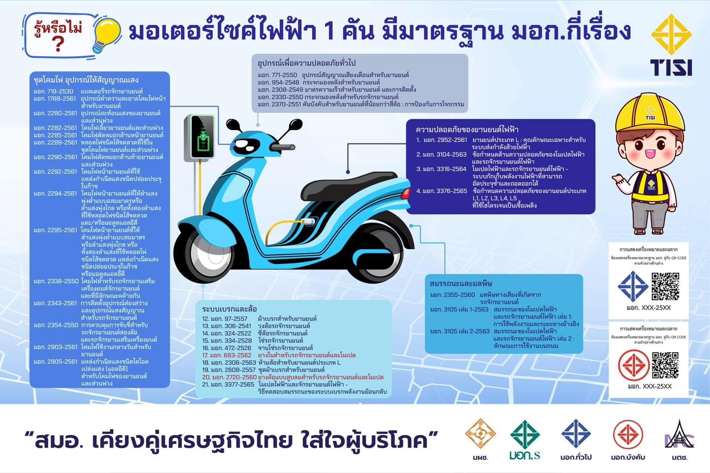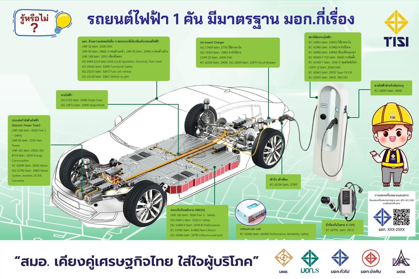 ด้าน นายบรรจง สุกรีฑา เลขาธิการEV Conversion กล่าวเพิ่มเติมว่า สมอ. ได้จัดทำมาตรฐานยานยนต์ไฟฟ้าและมาตรฐานที่เกี่ยวข้องยานยนต์ไฟฟ้าออกมาอย่างต่อเนื่อง โดยดำเนินการจัดทำมาตรฐาน ซึ่งมีทั้งที่อยู่ระหว่างการจัดทำและประกาศใช้แล้ว รวมจำนวน 138 มาตรฐาน เช่น สถานีชาร์จ รถยนต์ไฟฟ้า จักรยานยนต์ไฟฟ้า รถตุ๊กตุ๊กไฟฟ้า ระบบการสื่อสารระหว่างรถยนต์ไฟฟ้ากับโครงข่ายไฟฟ้า ระบบขับเคลื่อนรถยนต์ไฟฟ้า ระบบเบรกของรถจักรยานยนต์ไฟฟ้า เต้าเสียบและเต้ารับสำหรับยานยนต์ไฟฟ้า แบตเตอรี่สำหรับยานยนต์ไฟฟ้า และการป้องกันผู้โดยสารเมื่อเกิดการชนจากด้านหน้าและด้านข้าง เป็นต้น โดยมี 3 มาตรฐานที่อยู่ระหว่างดำเนินการเป็นมาตรฐานบังคับ ได้แก่ สถานีชาร์จ แบตเตอรี่สำหรับยานยนต์ไฟฟ้า และการป้องกันผู้โดยสารเมื่อเกิดการชนจากด้านหน้าและด้านข้าง