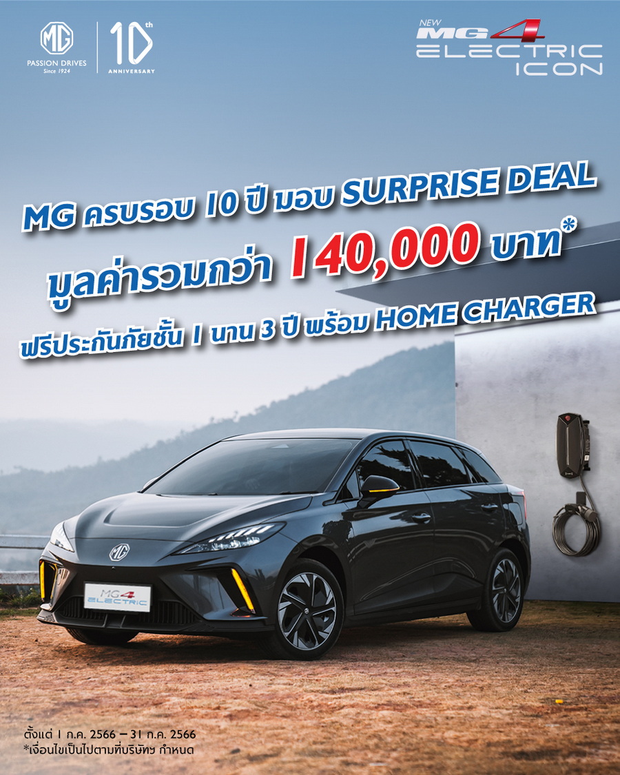 เอ็มจีประเดิมบุกตลาดรถ EV ครึ่งปีหลังด้วยแคมเปญพิเศษฉลองครบรอบ 10 ปี ในกลุ่มผลิตภัณฑ์รถยนต์ไฟฟ้า ด้วยดอกเบี้ย ต่ำสุด 1.79% นาน 48 เดือน ฟรี! ประกันภัยชั้นหนึ่ง นาน 1 ปี พร้อม MG Home Charger และค่าติดตั้ง รับประกันแบตเตอรี่สูงสุด 8 ปี หรือ 200,000 กิโลเมตร มูลค่ารวมกว่า 140,000 บาท เฉพาะ 1,000 คนแรก ระหว่างวันที่ 5 – 31 กรกฎาคมนี้