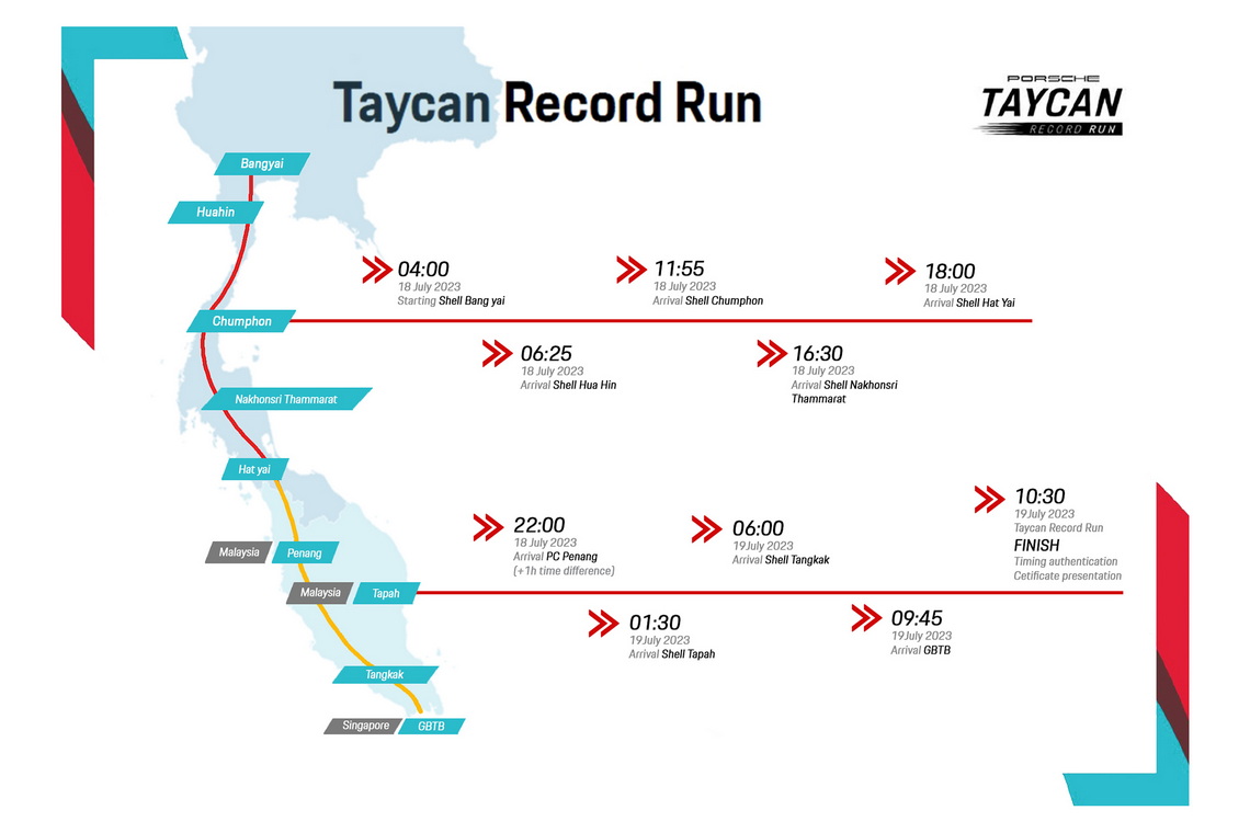 ความสำเร็จนี้ได้รับการขนานนามว่า “Taycan Record Run” โดยตัวแทนสื่อมวลชนนำโดย พลพัต สาเลยยกานนท์ จากประเทศไทย Pan Eu-Jin จากมาเลเซีย และ Desmond Chan จากสิงคโปร์ ทั้ง 3 คนได้ผลัดเปลี่ยนมือขับขี่บนเส้นทางที่ยาวไกลถึง 1,845 กิโลเมตร มีการหยุดรถเพียงเพื่อการชาร์จไฟสั้นๆ ระหว่างทางด้วยเครือข่าย Shell Recharge HPC และเครื่องชาร์จ ABB ขนาด 180 ถึง 360 กิโลวัตต์ สามารถใช้งานได้สะดวกและชาร์จได้เร็วเป็นพิเศษ และด้วยนวัตกรรมการติดตั้งระบบไฟฟ้าแรงดันสูง 800 โวลต์ ที่เป็นเอกลักษณ์เฉพาะของปอร์เช่ ไทคานน์ (Porsche Taycan) ช่วงเวลาการชาร์จไฟแต่ละครั้งที่ใช้บนเส้นทางนี้ จึงกินเวลาไม่เกิน 25 นาทีโดยเฉลี่ย...