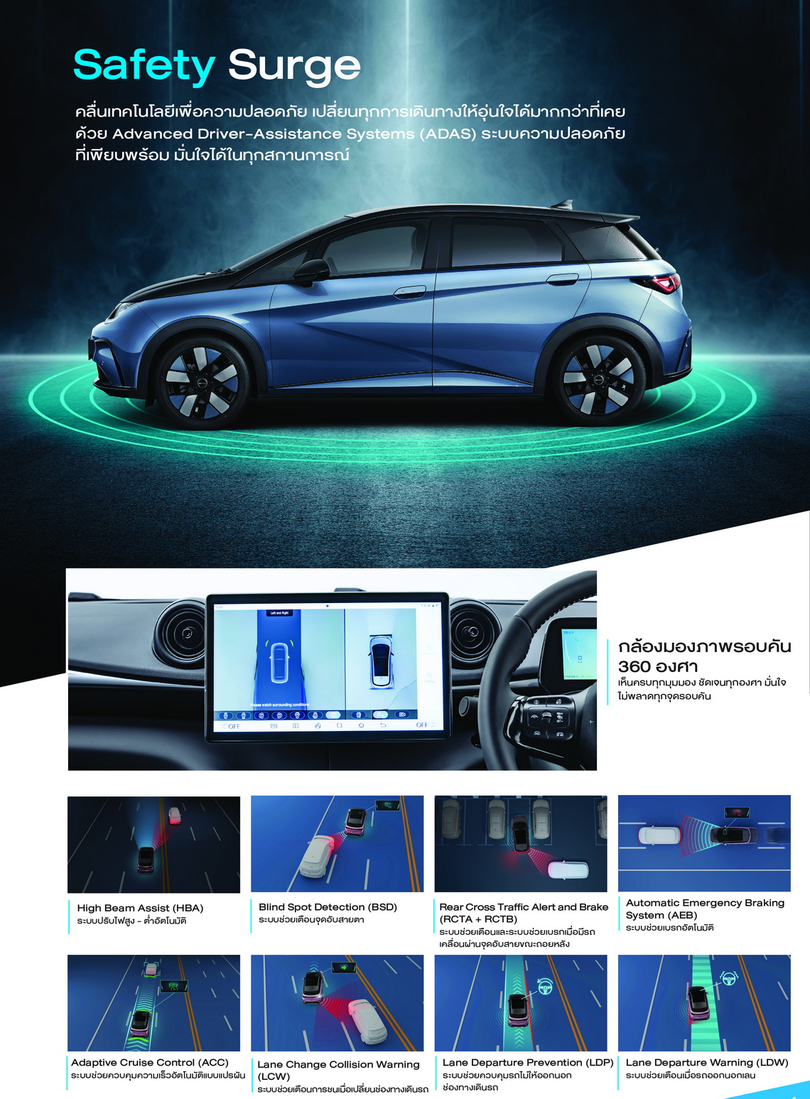มั่นใจในความปลอดภัยด้วยเทคโนโลยี ADAS ที่ช่วยป้องกัน และลดความเสี่ยงในการเกิดอุบัติเหตุบนท้องถนน ทำให้การขับขี่ BYD Dolphin เปรียบเสมือนมีเพื่อนร่วมทางชาญฉลาดคอยให้สัญญาณเตือนความปลอดภัย ให้ข้อมูลระยะทาง รวมทั้งการใช้พลังงานและความเร็วแบบเรียลไทม์ ด้วย BYD e-Platform 3.0 ที่ทำให้โครงสร้างแข็งแรงมีความสมดุลสูงสุดในการควบคุมการใช้กระแสไฟฟ้า แบตเตอรี่ และการขับเคลื่อน ทั้งยังมีนวัตกรรม Blade Battery ประสิทธิภาพสูงและอายุการใช้งานที่ยาวนาน หมดความกังวลเกี่ยวกับการบำรุงรักษาและค่าใช้จ่ายที่ตามมาในภายหลัง