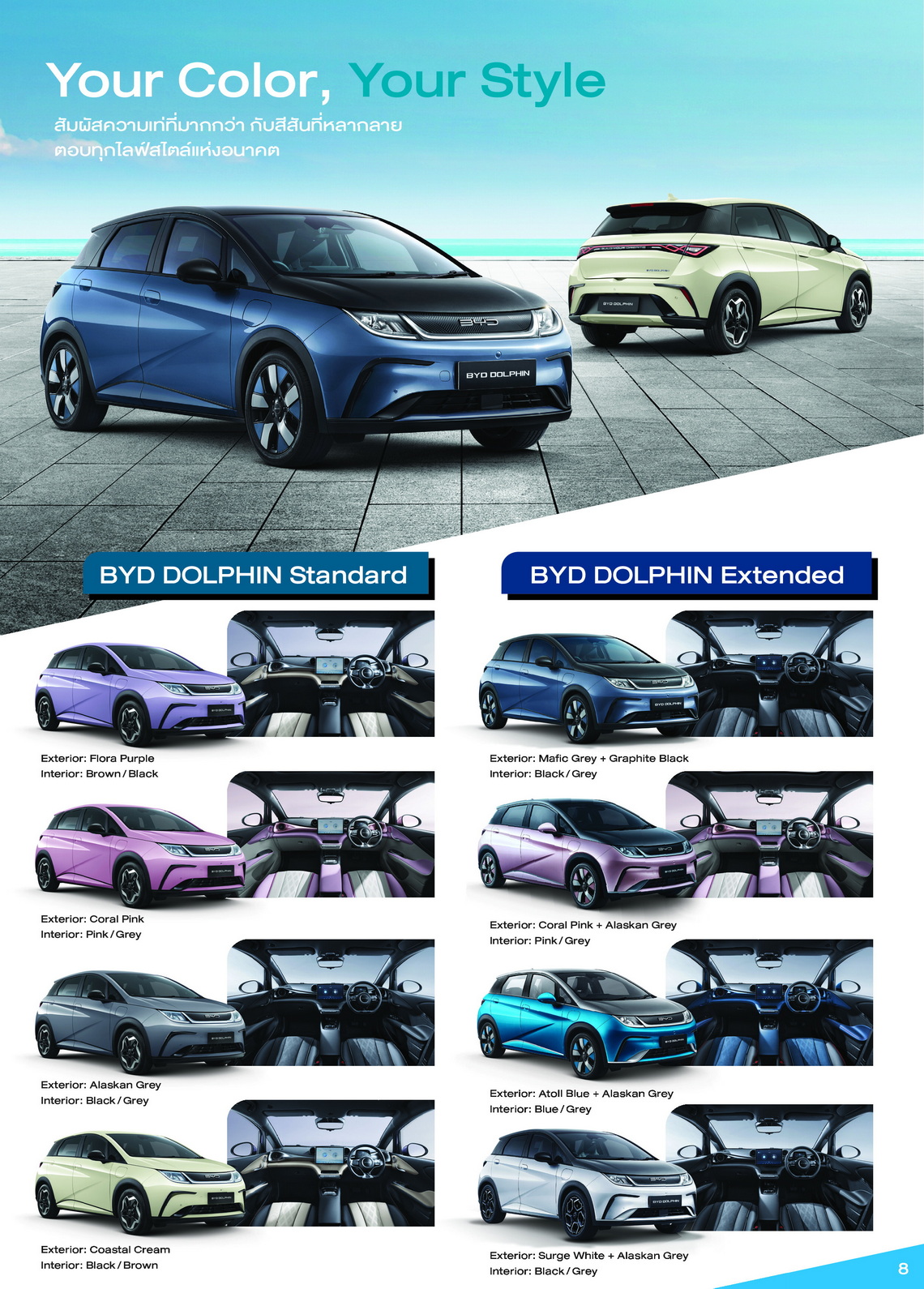 หากใครกำลังมองหาความสง่างามและความเป็นผู้หญิง BYD Dolphin มีสีภายนอกอย่าง Coral Pink และ Atlantis Grey เสริมด้วยการตกแต่งภายในสีชมพูและสีเทาที่แมตช์กันกับตัวรถภายนอกมาเป็นตัวเลือกที่ชวนฝัน บางคนอาจจะหลงใหลเสน่ห์อันเงียบสงบของ Atoll Blue และ Atlantis Grey พร้อมภายในที่ประดับประดาอย่างสวยงาม ใครที่ชอบรูปลักษณ์เพรียวบางและโฉบเฉี่ยว Atlantis Grey และ Pebble Black มาพร้อมภายในสีดําและสีเทา นับเป็นตัวเลือกที่ตอบโจทย์และรับประกันความสามารถในการดึงดูดได้อย่างแน่นอน