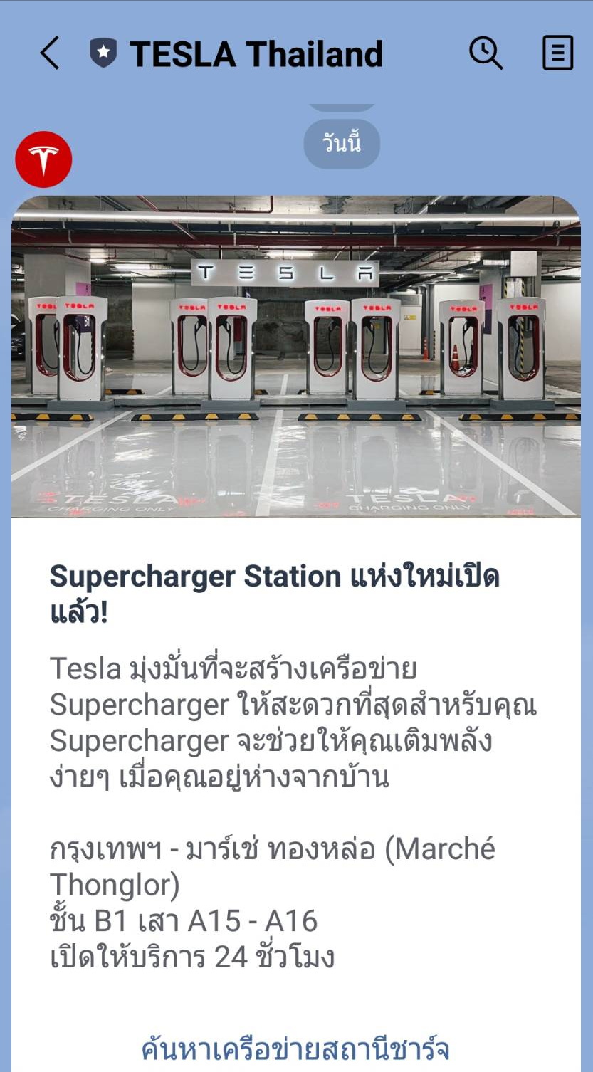 เพิ่งเปิดตัว TESLA CENTER BANGKOK ศูนย์บริการแห่งแรกในประเทศไทยไปหยกๆเมื่อวานนี้ (4 ส.ค. 2566) วันนี้ (5 ส.ค. 2566) เทสลา ประเทศไทย ยังมีข่าวดีต่อเนื่อง กับการเปิดตัวสถานี Supercharger เพิ่มอีกแห่งที่ มาร์เช่ ทองหล่อ (Marche Thonglor) มีหัวชาร์จ Tesla Supercharger V3 รุ่นใหม่ กำลังไฟ 250 kW ไว้บริการ 8 หัวชาร์จ บริเวณ ชั้น B1 เสา A15-A16 เปิดให้ชาร์จตลอด 24 ชั่วโมง