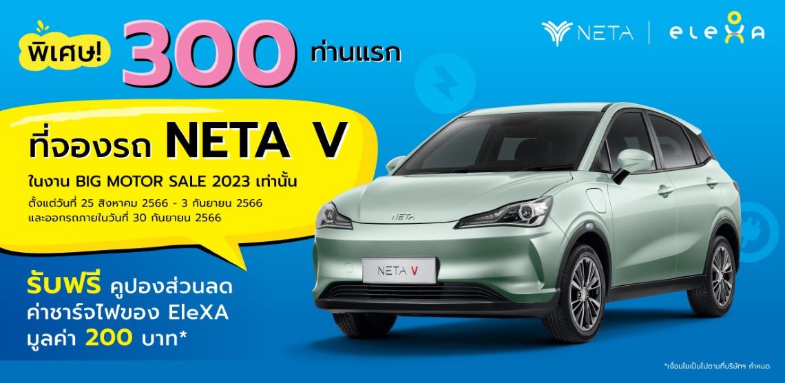 กระแสรถ EV ยังคงอยู่ในความสนใจของคนไทยอย่างต่อเนื่อง ล่าสุด เนต้า ออโต้ ได้ขนรถยนต์ไฟฟ้า NETA V เฉดสีหวานๆ พร้อมกับชุดแต่งใหม่ ไปออกบูธในงาน BIG MOTOR SALE 2023 ตั้งแต่วันที่ 25 สิงหาคม-3 กันยายน 2566พร้อมทั้งจัดโปรโมชั่นพิเศษ สำหรับผู้จองรถ NETA V และออกรถภายในวันที่ 30 กันยายน 2566 รับฟรี คูปองส่วนลดค่าชาร์จไฟของสถานีชาร์จ EleXA 300 คนแรก อ่านรายละเอียดเพิ่มเติมได้ที่ https://bit.ly/3OPqDpH