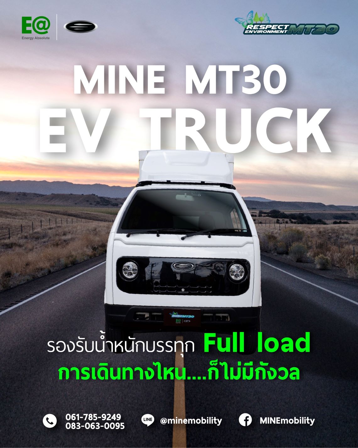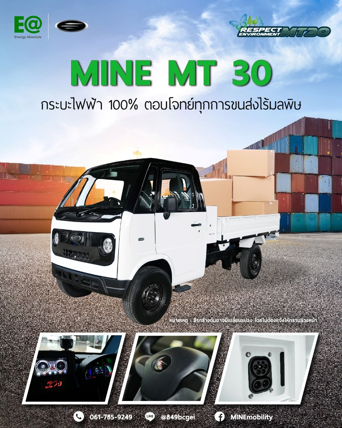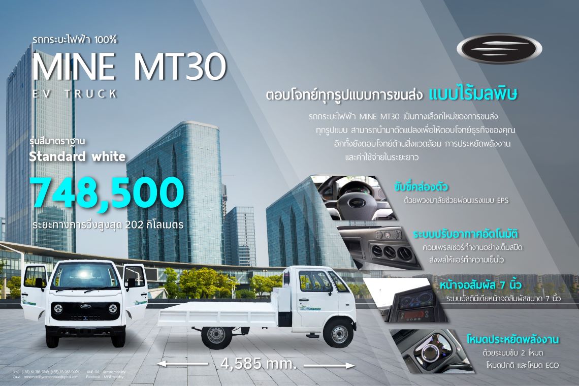 MINE Mobility รุ่น MT30 รองรับทุกช่วงเวลาของการขนส่ง ห้องโดยสารกว้าง เพดานหัวเก๋งสูง เพิ่มมุมมองการมองเห็นให้กว้างและชัดเจน ไม่ติดเวลา ขนส่งได้ 24 ชั่วโมง ตัวกระบะหนา ท้ายเรียบ เปิดได้ 3 ด้าน ไม่ติดซุ้มล้อ เพิ่มพื้นที่บรรทุกได้มากกว่ากระบะตอนเดียวด้วยกระบะท้ายที่ยาวถึง 2.5 เมตร