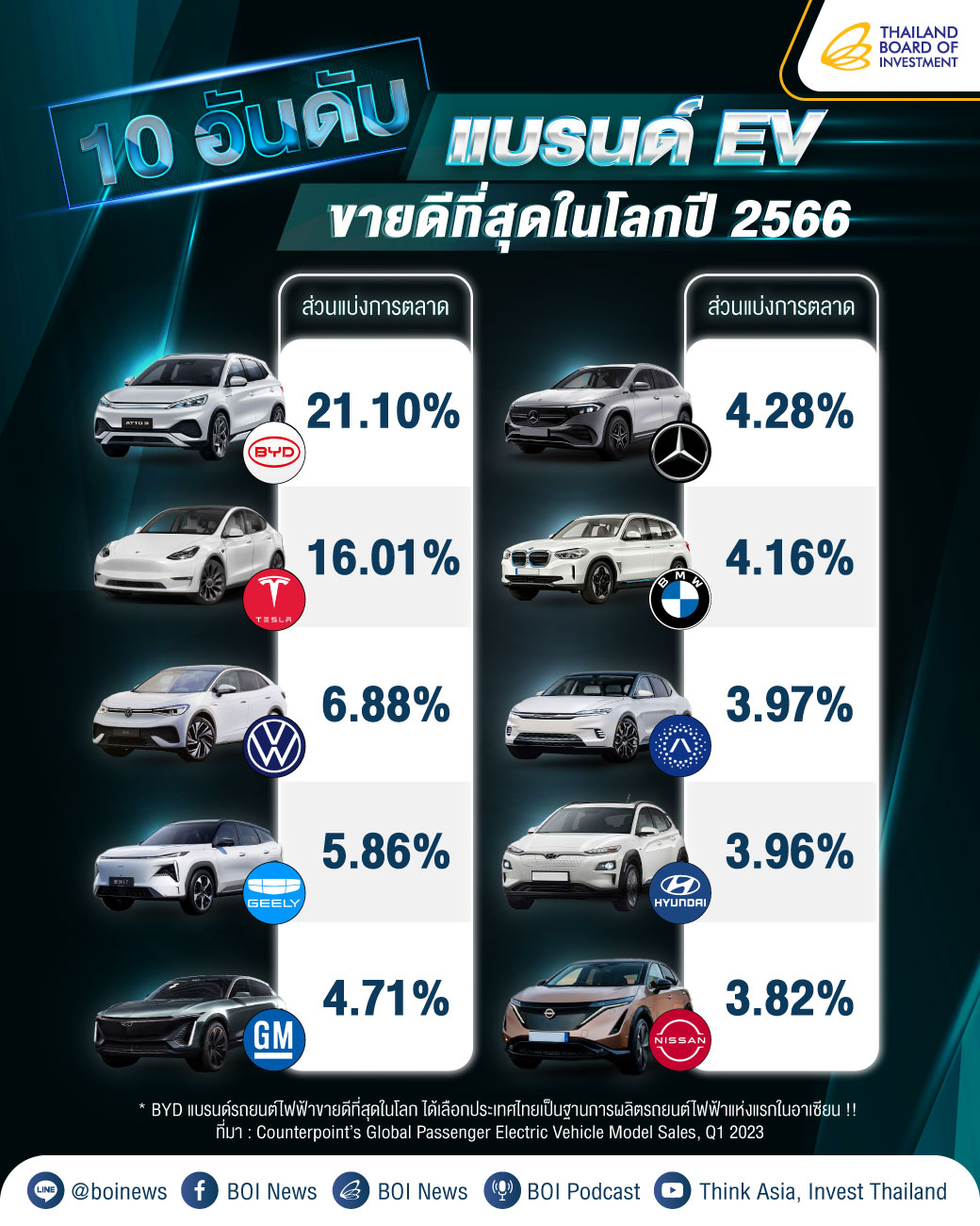 บีโอไอ มั่นใจประเทศไทยพร้อมเป็น “EV Hub” เผยผู้ผลิตรถยนต์ไฟฟ้าแบรนด์ดังทั่วโลกเลือกลงทุนในไทย พร้อมเผยส่วนแบ่งตลาด 10 อันดับแบรนด์ EV ระดับโลก