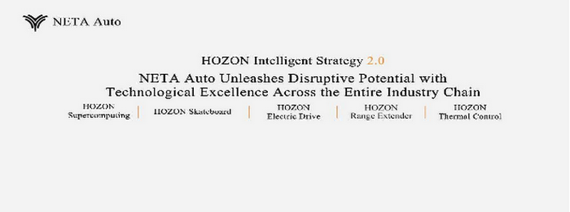 เพื่อเร่งกระบวนการผลิตและพัฒนาผลิตภัณฑ์อัจฉริยะสำหรับยานยนต์ไฟฟ้า HOZON Intelligent Technology Brand 2.0 NETA ได้ตั้งบริษัทใหม่ภายใต้ชื่อ HOZON Intelligent Technology เพื่อมุ่งสู่การเป็นผู้นำระดับโลกด้านเทคโนโลยีชิ้นส่วนรถยนต์พลังงานสะอาด ตอกย้ำความสำเร็จแบบก้าวกระโดดของ NETA ด้านเทคโนโลยียานยนต์ไฟฟ้า ครอบคลุมทั้งห่วงโซ่อุตสาหกรรม รวมถึงการวิจัยและพัฒนา และการผลิตครบวงจร HOZON Intelligent Technology ใช้นวัตกรรมทางเทคโนโลยีกำหนดทิศทางและวางแผนกลยุทธ์ครอบคลุมห่วงโซ่อุตสาหกรรม ด้วยผลิตภัณฑ์ที่โดดเด่นและสร้างความแข็งแกร่งให้กับอีโคซิสเต็มยานยนต์ไฟฟ้า ได้แก่ HOZON Super-Computer, HOZON Skateboard Chassis, HOZON Electric Drive System, HOZON Extended Range และ HOZON Thermal Control