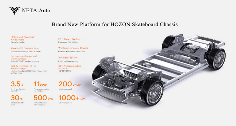 NETA ประกาศกลยุทธ์ ‘HOZON Intelligent Strategy 2025’ ตอกย้ำความมุ่งมั่นของบริษัทในการพัฒนาเทคโนโลยีอัจฉริยะสำหรับยานยนต์ไฟฟ้า เมื่อวันที่ 21 สิงหาคม 2566 โดยมีการสาธิต ‘HOZON Intelligent Technology 2.0’ ซึ่งเป็นแพลตฟอร์มเทคโนโลยีที่ทรงพลังที่สุดในประเทศจีน พร้อมเปิดตัว 5 เทคโนโลยียานยนต์ไฟฟ้าชั้นนำ ได้แก่ โฮซอน ซูเปอร์คอมพิวเตอร์ (HOZON Super-Computer), โฮซอน สเก็ตบอร์ด แชสซี (HOZON Skateboard Chassis), โฮซอน อิเล็กทริค ไดรฟ์ ซิสเต็ม (HOZON Electric Drive System), โฮซอน เอ็กซ์เทนดิด เรนจ์ (HOZON Extended Range) และโฮซอน เทอร์มัล คอนโทรล (HOZON Thermal Control) โดย NETA จะเริ่มการผลิตของผลิตภัณฑ์ในกลุ่ม ‘HOZON Intelligent Technology’ ในสายการผลิตอัจฉริยะในเดือนกันยายนนี้