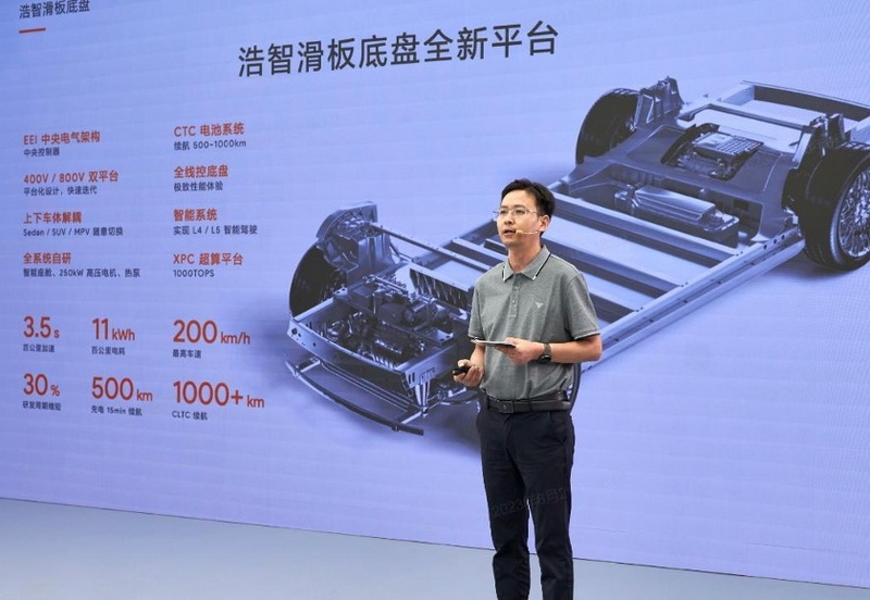 ผลิตภัณฑ์ต่อมาคือโฮซอน สเก็ตบอร์ด แชสซี (HOZON Skateboard Chassis) เป็นเทคโนโลยียานยนต์ไฟฟ้าชั้นนำอันดับที่ 2 ที่เปิดตัวในงาน โดยเป็นแพลตฟอร์มที่ใช้กับยานยนต์ไฟฟ้าหลากหลายรุ่นทั่วโลก มาพร้อมคุณสมบัติที่โดดเด่น เช่น ประสิทธิภาพสูง แข็งแรงทนทาน รองรับ C-rate สูง การพัฒนาแบบแยกส่วนของโครงสร้างตัวถังทั้งช่วงบนและส่วนล่าง ผสานกับซอฟต์แวร์และฮาร์ดแวร์ที่ทันสมัย เพิ่มประสิทธิภาพการผลิตมากถึง 20 เท่า ลดพื้นที่การผลิตลง 50% และลดการใช้ทรัพยากรในการวิจัยและพัฒนาลง 30% ส่งผลให้ต้นทุนการผลิตต่ำลงและประสิทธิภาพกระบวนการผลิตเพิ่มขึ้น